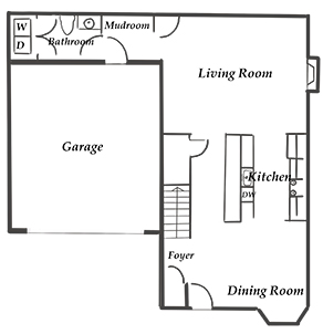 A hallway gives access to the laundry room, half bathroom, and back porch area, which connects to the attached 2-car garage. A broad driveway provides 2-4 additional parking spaces.
